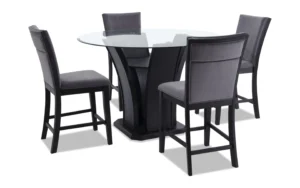 If you’re searching for a stylish centerpiece that blends comfort, affordability, and modern design, look no further than the Cosmopolitan 5-Piece Black & Gray Upholstered Round Counter-Height Dining Set. Priced at an attractive $599 and available through Bob’s Discount Furniture, this set offers remarkable value without sacrificing style or quality.