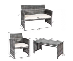 One of the first things you’ll notice about the Costway Mix Gray 4-Piece Rattan Wicker Set is its sleek, contemporary design. The mix gray rattan weave perfectly complements the beige-white cushions, creating a clean, neutral look that pairs well with any outdoor décor.