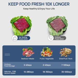 Vacuum-sealed food can last up to 10× longer than conventional storage methods, especially when sealed properly. That means less spoilage, fewer freezer burn losses, and more flexibility in meal planning.