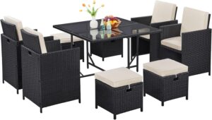 The first thing you’ll notice about the Yaheetech 9-piece Set is its sleek design. Featuring black rattan wicker with beige removable cushions, this dining set instantly elevates any outdoor area with a modern yet timeless look. The neutral tones make it easy to pair with other décor, from colorful garden accents to soft outdoor lighting.